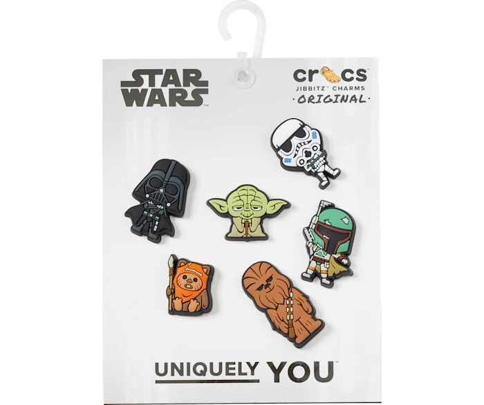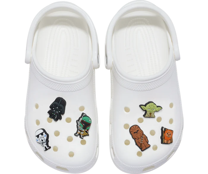 Pop some personality into your shoes with these Star Wars Character 6 Pack Jibbitz™ charms. They’re the perfect addition to your favorite pairs of clogs, slides, and more.